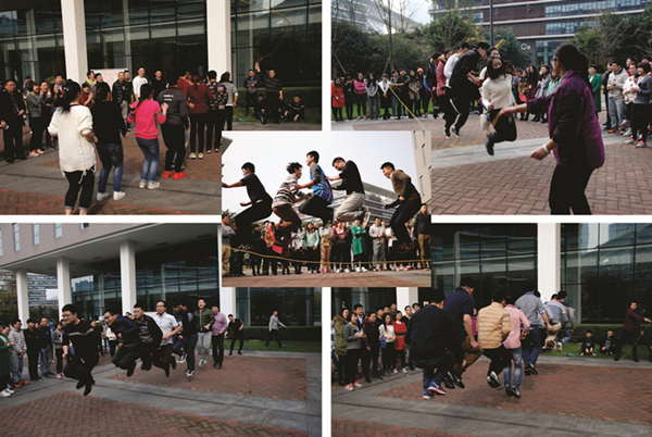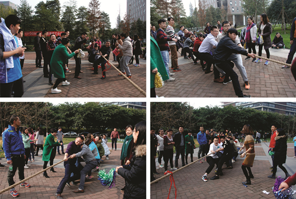 各中心及总经办分别组成8个团队,首先进行三比两胜的拔河比赛,第一轮胜出的4个队伍晋级下一场跳长绳,最后决胜三组冠、亚、季军,获得比赛红包大奖。