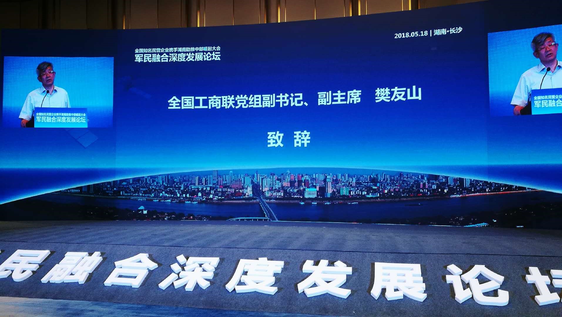 5月18日,全国知名民营企业携手湖南助推中部崛起大会军民融合深度发展论坛在长沙市举行。全国工商联党组副书记、副主席樊友山,副省长陈飞出席并致辞。