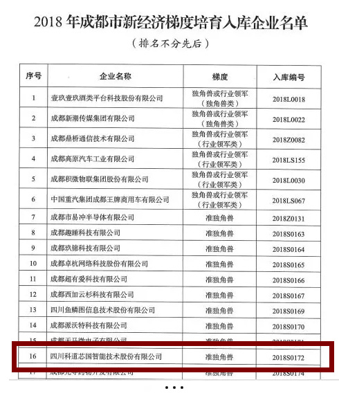为进一步加强对新经济企业的支持和服务,加速培育一批成长性高、爆发力强、潜力大的优质新经济企业,成都市作为全国首个设立新经济发展委员会的城市,实施了“新经济企业梯度培育计划”。该计划明确将按照企业成长周期不同阶段进行梯度划分,包含独角兽或行业领军企业、准独角兽企业、种子企业三个梯度。四川科道芯国智能技术股份有限公司(以下简称KEYDOM)在数字经济、智能经济领域一直保持着迅猛的发展势头,在2018年新经济梯度培育企业评定中,从全市逾3万家新经济企业中脱颖而出,成功上榜“准独角兽”企业榜单。